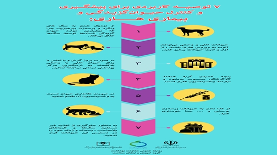 ۳. در صورت بروز گزش و یا تماس با بزاق حیوان اهلی یا وحشی بلافاصله به نزدیکترین مرکز بهداشتی درمانی مراجعه نمائید.
